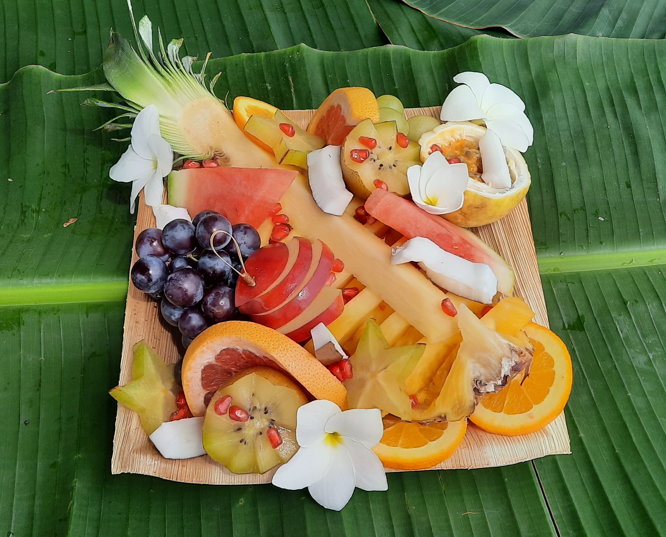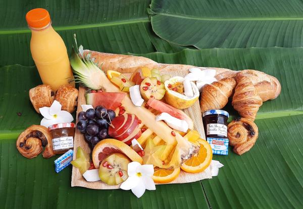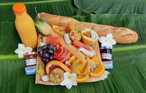 Fresh fruits tray, 1 baguette, jam of the day, butter, fresh orange juice 50 cl