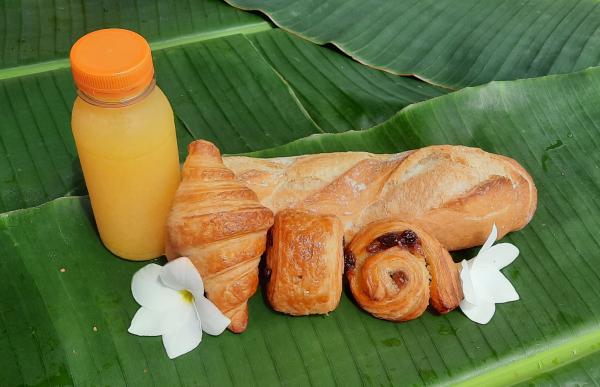 1 Mini croissant, 1 mini pain au chocolat, 1 raisins roll, 1 bread, fresh orange juice 25 cl