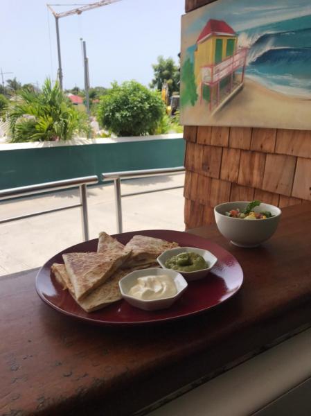 Galette, red beans, mozza/cheddar mix, salad, tomatoes, sour cream