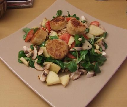 Breaded goat cheese, honey, salad, tomatoes, walnuts, apple, bacon, red cabbage/carrot mix, homemade dressing