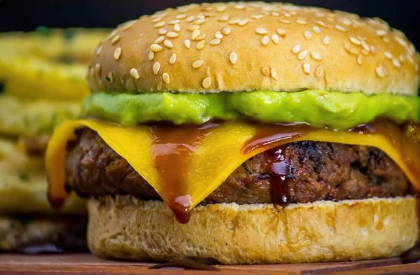 Steak, beans, chedar, guacamole, salad, tomato, onion, burger bread, pickle