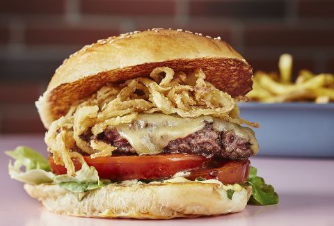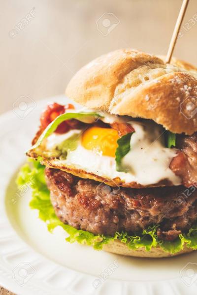 2 Steaks, shallots, cheddar, egg, bacon, lettuce, tomato, burger bun, pickle