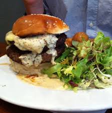 Steak, pepper sauce, cheddar, bacon, salad, tomatoe, onion, burger bread, pickles