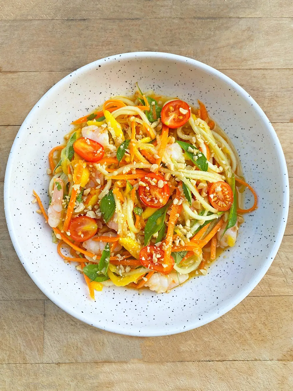 Salad, red cabbage/carrot mix, noodles, diced tomatoes, peanuts, coriander, homemade Thai dressing