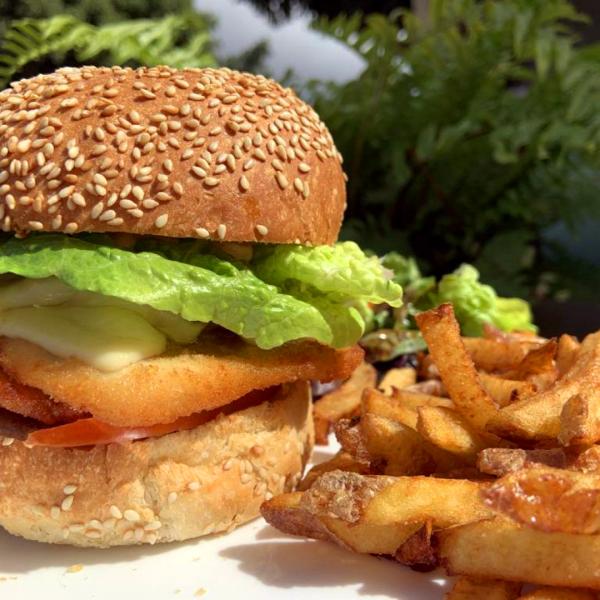 Breaded chicken, emmental cheese, bacon, avocado, salad, tomatoes, chef's sauce with ketchup, soy sauce, honey