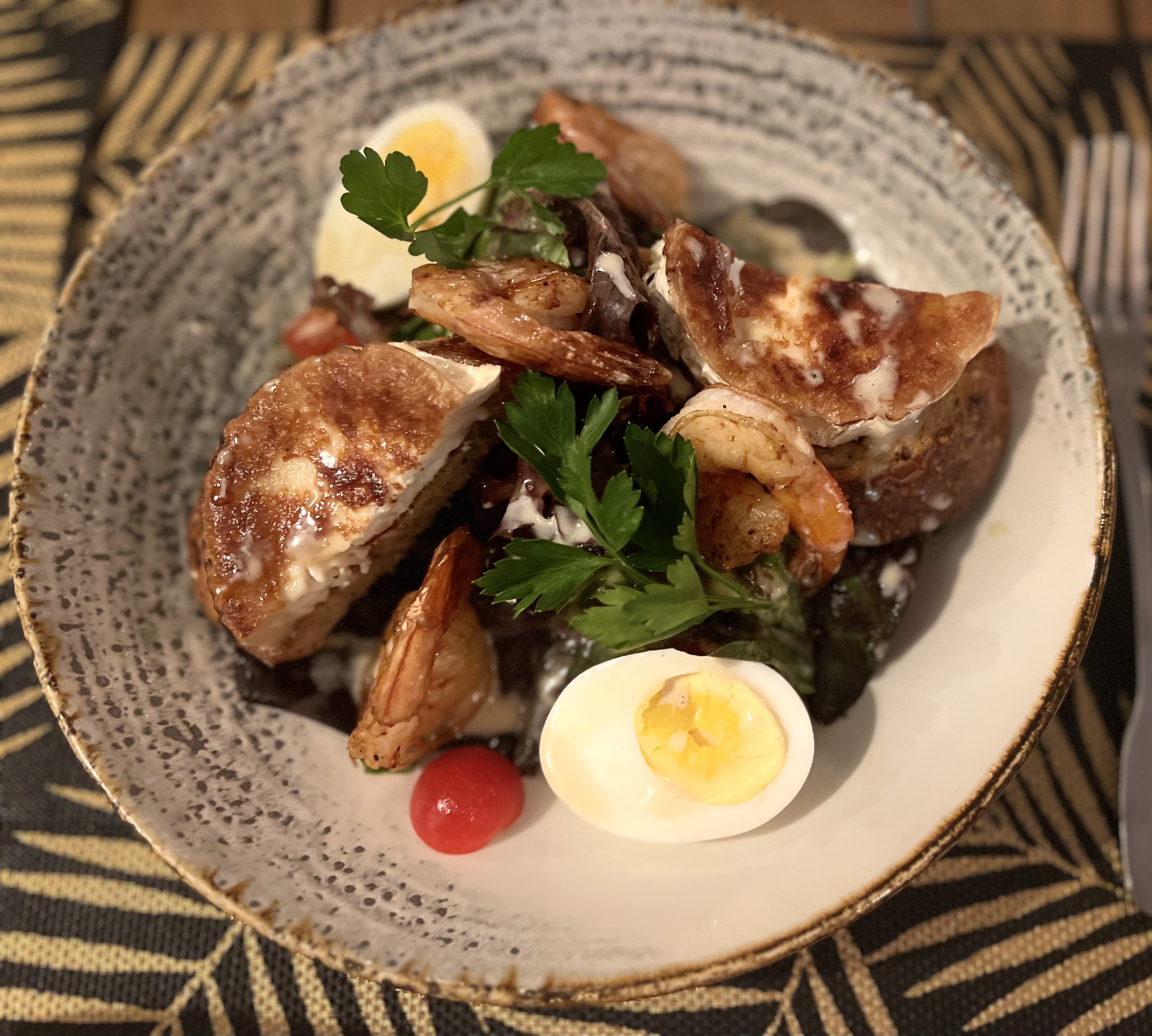 Prawns, warm goat's cheese toast, bacon…