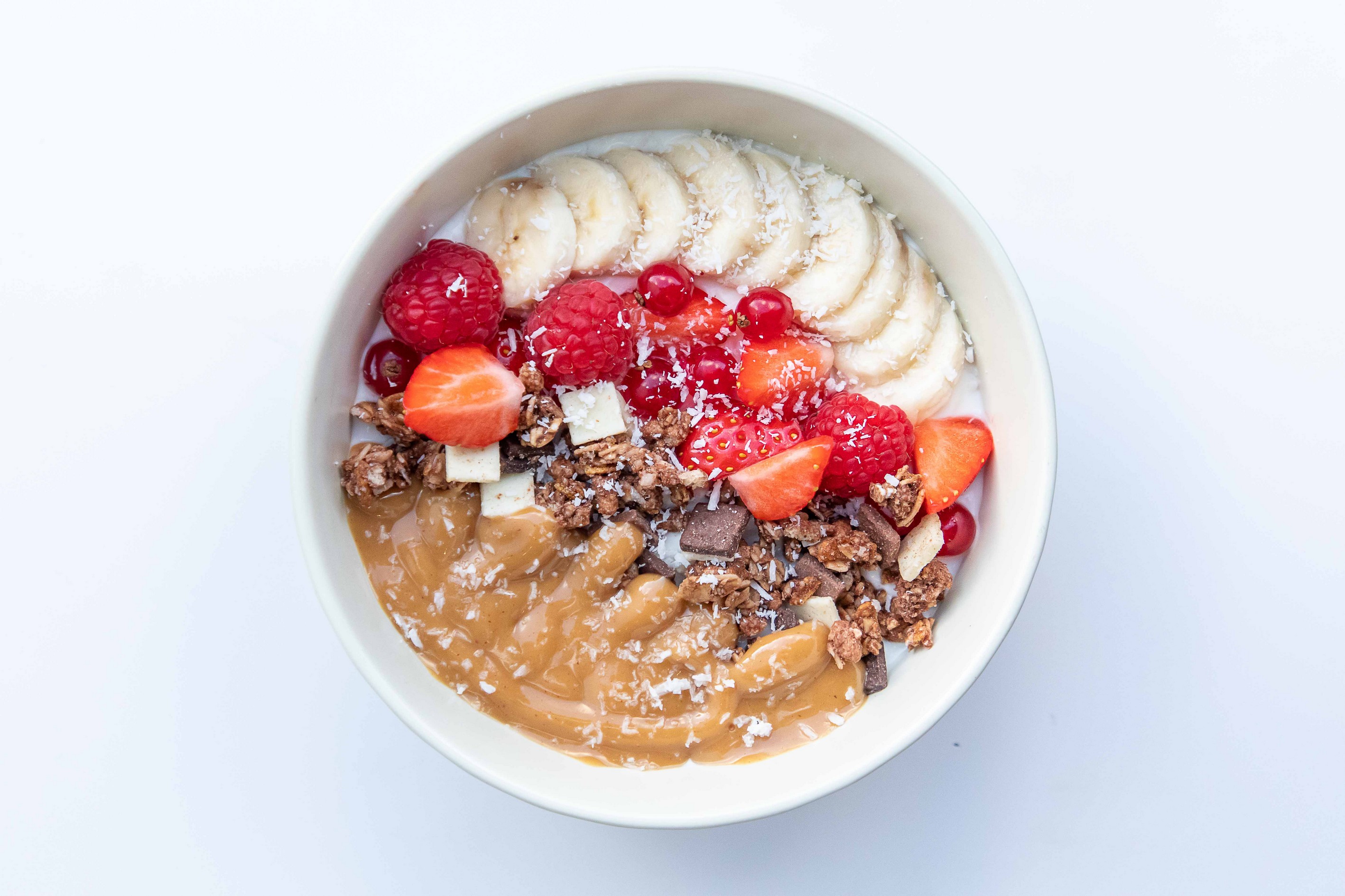 Banane, fruits rouges, beurre de cacahuète, granola chocolat, coco râpée