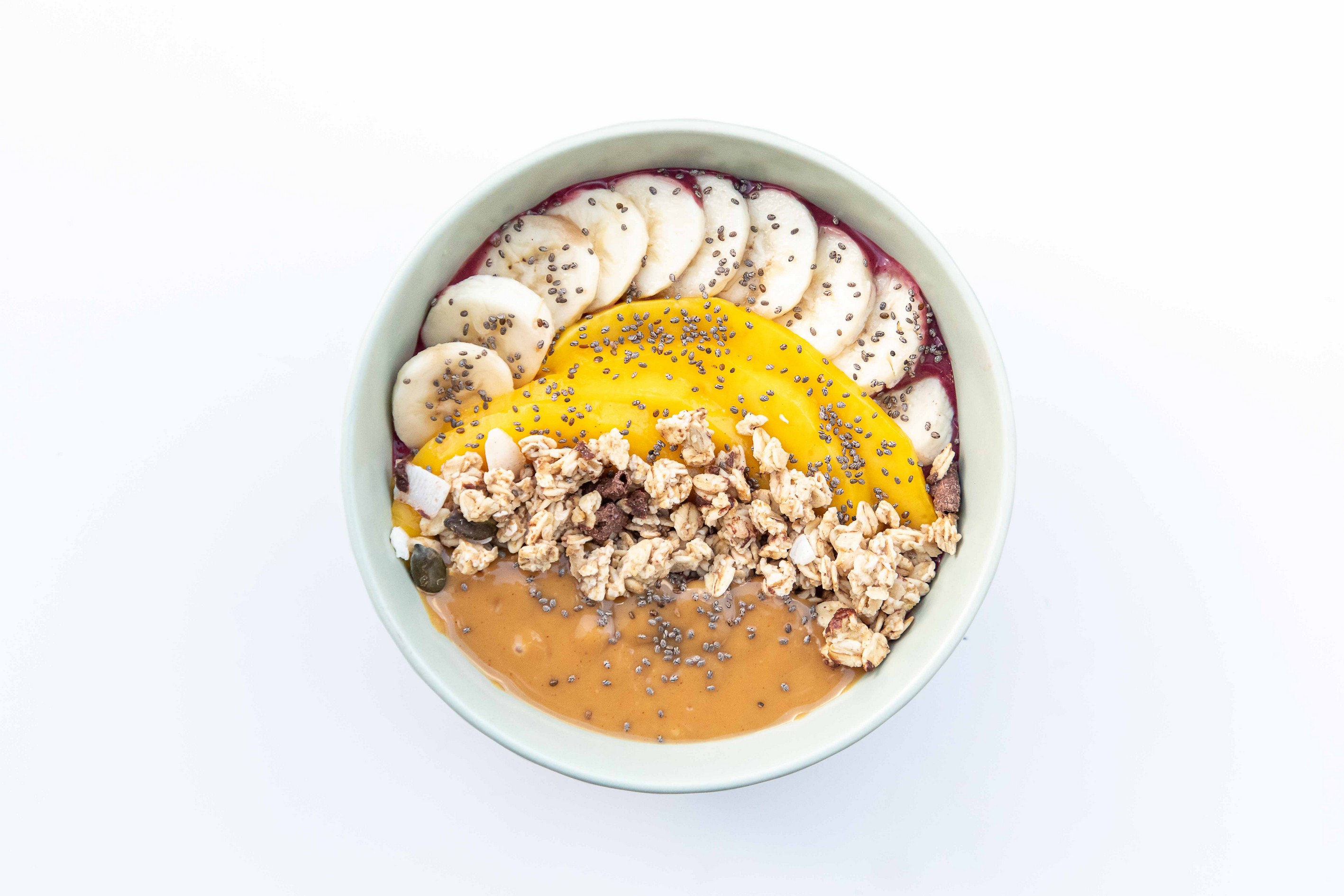 Banane, mangue, beurre de cacahuète (servi à part), granola chocolat